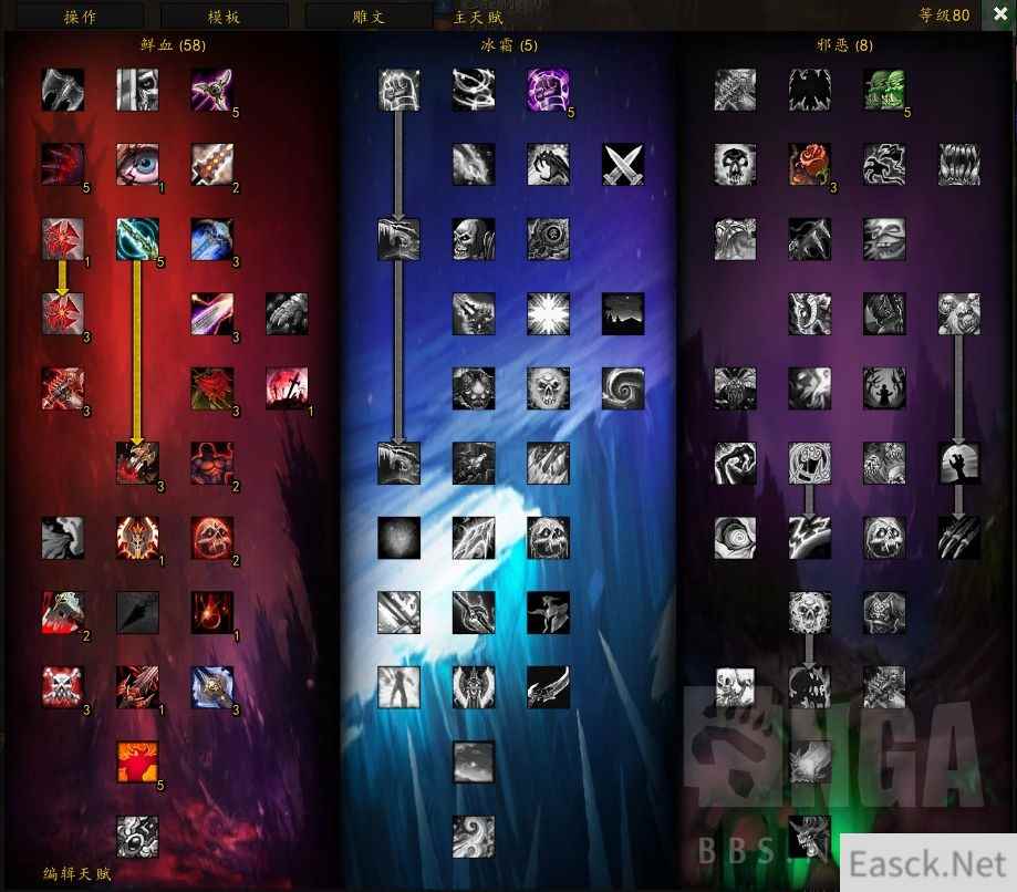 首先这个天赋点出了DK所有最强的生存向天赋,足以胜任团本坦克位置,在这个天赋下,你可以尽可能多打灵界打击,而不是仅仅依赖冰触来制造单体仇恨 其次点出了血腥打击、心脏打击、病变3个群拉能力的天赋,枯萎凋零15s冷却基本可以当做FQ的奉献踩,血液沸腾加强伤害让你能够拉得住小怪,以及心脏打击同时攻击两个相邻的目标。 另外如果想要体验单刷,可以选择点出血虫和强化鲜血灵气,提高吸血和续航能力。 |