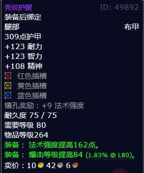 魔兽世界wlk版本快上线了,在WLK版本玩家的专业技能上限提高到了450,可以制作新的裁缝道具,那么魔兽世界wlk裁缝图纸有哪些?下面就给大家带来魔兽世界wlk裁缝图纸大全。 魔兽世界14天游戏时间免费领取地址:点击查看 魔兽世界wlk裁缝图纸大全亮纹护腿ID: 49892 装备后绑定腿部布甲 309点护甲 +123 耐力 +123 智力 +108 精神 红色插槽 黄色插槽 蓝色插槽 镶孔奖励:+9 法术强度 耐久度 75 / 75 需要等级 80 物品等级264 装备: 法术强度提高162点。 装备: 爆击等级提高84 (1.83% @ L80)。