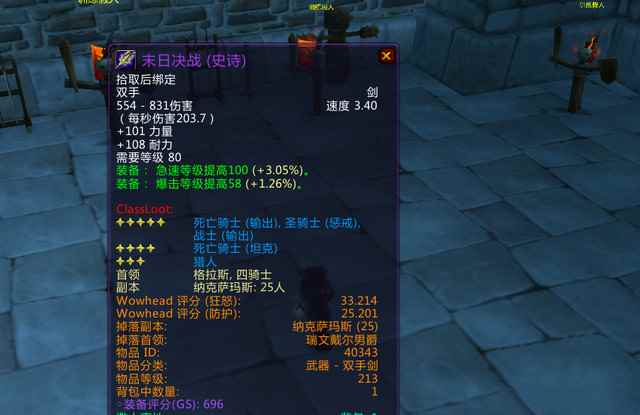 第一款武器名为“末日决战”,这是重制版NAXX中的4DK掉落的一把双手剑,虽然是重制版,但是末日决战在60级版本中是不曾出现的,因此也是一把全新的武器。