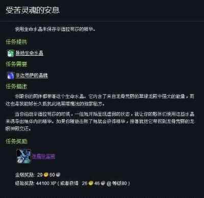 注意:这个任务时限是30分钟(初期版本为20分钟),计算时间是从团队中任何一人踏入血议会区时开始计算,所以如果不打算立即做这个周常,务必不要先接任务。 就是说30分钟内你们实际上需要完成“鲜血议会”和“鲜血女王兰娜瑟尔”2场战斗,这个时限就我的实际经验来看一般最少能支持灭团一次。 另外,如果你们在打血女王的过程中时限到了,即使成功击杀BOSS也会计算任务失败。 冰龙区周常:受苦灵魂的安息 辛达苟萨