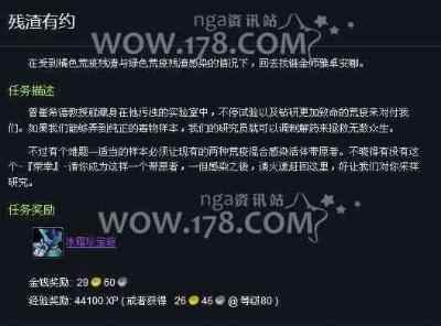 还有一种傻瓜式打法: 所有人都2个人站一组,和其他组散开,只要运气不是很糟糕连续疾病点一组里的2个人就不会有人死。即使死了,就跑尸体复活吧,适合天然呆众多的野团使用。 注意点:由于算是小怪战,所以这个战斗的阵亡玩家是可以跑尸体回来继续战斗的。BOSS的血很多,战斗时间往往会较长,所以阵亡的人请马上跑路。 不用担心跑尸在副本外的时候完成不了任务,只要BOSS倒下,任务就算完成。 瘟疫区周常:残渣有约 当你击杀掉小萨鲁法尔,你可能在通往2、3、4区的大厅门口处接到这个周常任务,NPC名称叫:链金师雅卓安娜。