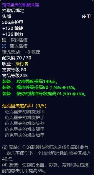 魔兽世界WLK版本新增了T9套装,可以在TOC获得,有一些职业的套装效果十分强力,比如盗贼,那么魔兽世界盗贼t9套装属性是什么?下面就给大家带来魔兽世界盗贼t9套装属性介绍。 魔兽世界14天游戏时间免费领取地址:点击查看 魔兽世界盗贼t9套装属性2 件:你的割裂技能每次造成伤害时会有一定几率使你下一个技能所消耗的能量值减少40点。 4 件:使你的出血、影袭、背刺和毁伤技能的爆击几率提高5%。