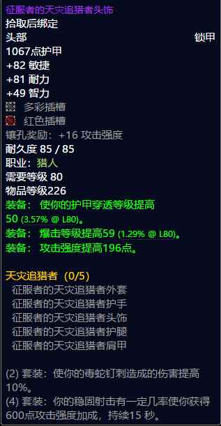 魔兽世界WLK版本新增了很多套装,比如T8套装,这是一套属性很强的套装,很适合PVE,那么魔兽世界猎人t8套装属性是什么?下面就给大家带来魔兽世界猎人t8套装属性介绍。 魔兽世界14天游戏时间免费领取地址:点击查看 魔兽世界猎人t8套装属性2 件:使你的毒蛇钉刺造成的伤害提高10%。 4 件:你的稳固射击有一定几率使你获得600点攻击强度加成,持续15 秒。