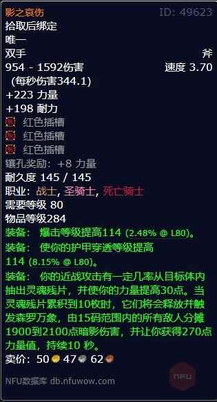 魔兽世界的wlk马上就要上线了,今天给大家带来的是游戏里面的橙斧属性的介绍,还有小伙伴不清楚属性是什么,那么下面就为大家带来了具体的游戏内容. 魔兽世界14天游戏时间免费领取地址:点击查看 魔兽世界橙斧属性影之哀伤就是我们口中所说的橙斧,拾取后绑定,唯一,有三个红色插槽,伤害954-1592(每秒伤害344.1)。 属性:+223力量,+198耐力,镶孔之后还会获得+8力量的奖励。 耐久度145,需要等级80,物品等级284。