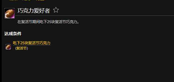 魔兽世界中有着许许多多的成就,相信很多小伙伴们不知道巧克力爱好者成就怎么完成,今天给大家带来的是巧克力爱好者成就攻略,那么小编给大家带来具体完成方法。 魔兽世界14天游戏时间免费领取地址:点击查看 巧克力爱好者成就攻略在复活节期间吃下25块复活节巧克力。