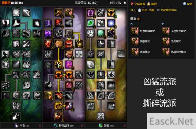 魔兽世界wlk野德怎么升级1. 凶猛/撕碎流派 撕碎流派是当溢出星的时候能量多的情况下继续打撕碎.这个流派的好处是不需要动太多脑子,在基本功扎实的情况下只需要保证能量不会亏空导致后续的割裂和咆哮打不出去,然后多打撕碎.这个流派非常适合运动战和多线战斗,可以灵活的适应很多战斗场景以及短时间的战斗。 而凶猛流派则是同样计算好亏空的情况下,打出凶猛撕咬.凶猛撕咬在天赋的加持下暴击率提升,会造成可观的伤害.在大量暴击攒星和清晰的情况下,凶猛撕咬能在咆哮和割裂都大于15秒并且猛虎即将可用(换句话说,你打完凶猛后有足够的时间补一套割裂和咆哮)无损打出。 这两个流派并没有明显的区分,出于本能有时候当凶猛可行的时候总会手痒去打一个.因此在理论上我们不把它们分太清。 天赋方面核心区别在1-2的野性侵略(强化凶猛撕咬)来提升凶猛的伤害.即便是正常非Raid状态下,多的凶猛伤害都可以在各种情况下适用。