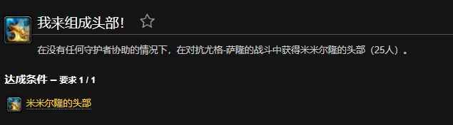 成就系统作为魔兽世界的一种玩法,相信有不少小伙伴有收集成就的爱好,那么小伙伴想知道如何完成我来组成头部这个成就,完成方法需要在没有任何守护者协助的情况下,在对抗尤格-萨隆的战斗中获得米米尔隆的头部(25人)。 魔兽世界14天游戏时间免费领取地址:点击查看 魔兽世界我来组成头部成就怎么做需要在没有任何守护者协助的情况下,在对抗尤格-萨隆的战斗中获得米米尔隆的头部(25人)。