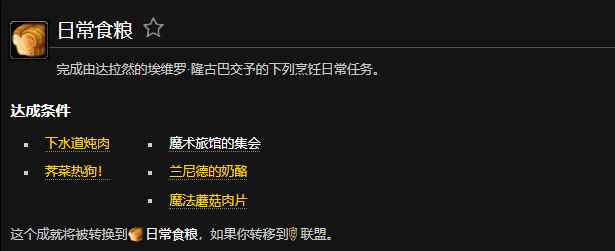 魔兽世界中有着许许多多的成就,相信很多小伙伴们不知道日常食粮成就部落怎么做,今天给大家带来的是日常食粮成就部落攻略,那么小编给大家带来具体完成方法。 魔兽世界14天游戏时间免费领取地址:点击查看 日常食粮成就部落攻略完成由达拉然的埃维罗·隆古巴交予的下列烹饪日常任务: 下水道炖肉 荠菜热狗! 魔术旅馆的集会 兰尼德的奶酪 魔法蘑菇肉片