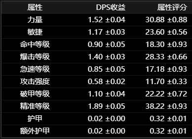 一个经常的误区是破甲等级,初期基础破甲低,所以破甲收益其实很低。 (后期其他属性大收益大幅度下降,破甲边际收益却能提升50%左右,才能凸显破甲的重要)。 而初期基础攻强低,所以力量、攻强收益更高。 暴击因为暴击伤害高(包括重伤)和乱舞的机制,收益也不差。 急速一直都是最烂的属性。 命中在8%之后(天赋可+3%)收益极低,尽量避免高于8%的部分 精准在6.5%前收益很高,但是WLK不同于TBC,不仅有很多精准装备(包括前期),而且还有精准宝石,所以精准很容易达标,多出来的也只能通过宝石调节1:1转换为力量 因为命中容易溢出,所以最终用于装备选择的评分为: