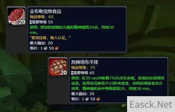 5、任务完成后,奖励一桶鱼或一箱肉,自选一个,能够开出来4种绿色食谱。 6、其中热辣塔布羊排能提供20点命中和精神,是TBC盗贼必备烹饪,缺命中的物理系职业也需要常备。