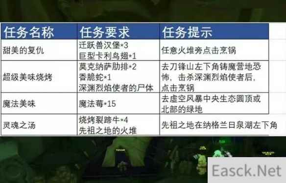 2、烹饪技能需要最低275+,任务池共有4个,每天随机刷新1个。 3、除了魔法美味是采集任务外,其他3个都需要用指定的任务材料完成烹饪任务。 4、任务材料大多是烹饪成品,可以自己做(技能325+),也可以直接在AH买现成的。