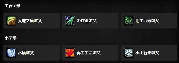 大型雕文: 大型雕文: 大地之盾雕文- 大地之盾的治疗量增加了 20% 治疗链雕文- 治疗链额外增加1个目标。 地生武器雕文-地生武器的触发几率提高5%。 小型雕文 水中呼吸雕文 - 水中呼吸不再需要试剂。 再生生命雕文 -转世法术不再需要试剂。 水上行走雕文-水上行走不再需要试剂。 « 1 2 3 »友情提示:支持键盘左右键"←""→"翻页