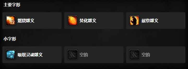 大型雕文: 燃烧雕文- 燃烧法术不再从目标身上消耗献祭或暗影烈焰。 焚化雕文-焚化造成的伤害提高5%。 献祭雕文-献祭的周期性伤害提高10%。 小型雕文: 吸取灵魂雕文-吸取灵魂技能有几率产生额外碎片。 « 1 2 3 »友情提示:支持键盘左右键"←""→"翻页