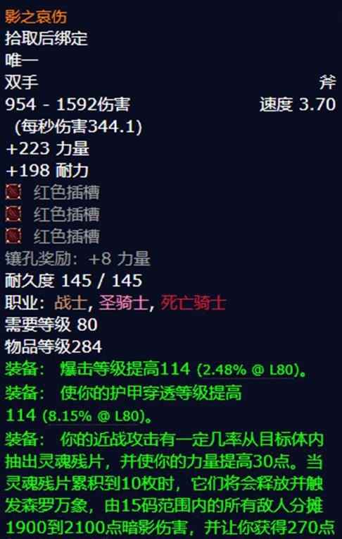 后续做任务时候请玩家务必装备上“影锋”!!! 3)任务“千魂之宴”: 大领主达里安·莫格莱尼要玩家用暗影之锋杀死ICC中1000个巫妖王的爪牙。 l装备上“影锋”,并且只能杀死ICC中的能够提供“灰烬审判军”声望的怪物。 4)任务“橙斧三部曲第一步:灌注邪恶”: 击败至少25人ICC BOSS普崔希德教授。 l装备上“影锋”,战斗开始后点击BOSS旁边桌子上的合计瓶,玩家会变成一只憎恶,并且拥有一个新的技能:“暗影充能”。该技能需要100能量才可以使用,能量通过吸地上的绿水获得,能量满后使用“暗影充能”给自己的影锋充能。最后等BOSS战进入P3阶段,解除憎恶状态后,玩家的右上角有一个持续6分钟的“暗影充能”BUFF,在BUFF状态下击杀普崔希德教授,就完成了“橙斧三部曲”任务第一步:灌注邪恶。 5)任务“橙斧三部曲第二步:灌注鲜血”: 击败至少25人ICC BOSS鲜血女王兰娜瑟尔。 l装备上“影锋”,先冲上去打BOSS,其他玩家不动不参与,直到被BOSS咬了中“鲜血镜像”这个DEBUFF,其他才开始进入战斗。中了“鲜血镜像”1分钟后会变身,变身后在10秒内咬第一个队友,让被咬的队友去火里烧死自己。以此类推,咬死第二个和第三个队友。最后RUSH掉BOSS,注意做任务的玩家全程不要死亡。这样,就完成了“橙斧三部曲”任务第二步:灌注鲜血。 6)任务“橙斧三部曲第三步:灌注鲜血”: 击败至少25人ICC BOSS辛达苟萨。 l装备上“影锋”,吃四次BOSS的“冰霜吐息”技能,然后击败BOSS,注意做任务的玩家全程不要死亡,就完成了“橙斧三部曲”任务第三步:灌注鲜血。做任务的玩家可以选择T天赋和堆冰抗后吃BOSS技能。 7)任务“破碎的王座”: 从25人ICC BOSS身上获取50块“影霜碎片”。 收集完碎片,交给大领主达里安·莫格莱尼后,就可以获得橙武“影之哀伤”。 8)任务“巫妖王的末日”: 装备“影之哀伤”击杀25人 ICC巫妖王后,获得5个任务物品:亚历山德罗斯的灵魂碎片、阿尔萨斯的训练剑、吉安娜的吊坠、白银之手骑士团徽章、希尔瓦娜斯之血。 这些任务物品可以兑换:血色死亡战马的缰绳、穆拉丁的礼物、希尔瓦娜斯的音乐盒、光明使者战袍和吉安娜的吊坠。 |