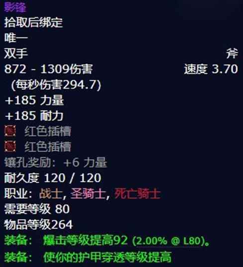 获取流程: 1)任务前置: l只能战士、圣骑士和死亡骑才能接到任务; l在“灰烬审判军”中达到友善声望,在ICC副本内的大领主达里安·莫格莱尼处接到起始任务:“神圣的与堕落的”。 2)任务“神圣的与堕落的”: 交给达里安·莫格莱尼下面的物品: l圣光的复仇——龙骨荒野的霜之哀伤洞穴; l25个源生萨隆邪铁——25/10人英雄ICC的BOSS概率掉落; l腐面的强酸血液——25 ICC BOSS腐面100%掉落; l烂肠的强酸血液——25 ICC BOSS烂肠100%掉落。 获得武器“影锋”。