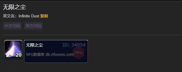 在魔兽世界怀旧服中,想必现在有很多玩家对于无限之尘有什么用,具体使用途有哪些呢,相信很多小伙伴好奇,那么今天我就为大家带来了无限之尘用途介绍。一起来看看吧。 魔兽世界14天游戏时间免费领取地址:点击查看 无限之尘用途介绍这个是最基础的材料用的较多的,是FM基本每个新的图样都用这个,还有就是珠宝梦魇之泪能用到他,自己可以存点以后FM什么的用 。