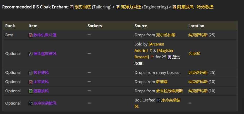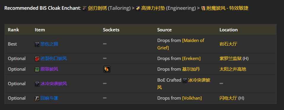 背部装备团本前的最优解是悲伤之拥,P1阶段是致命仇敌斗篷,附魔推荐剑刃刺绣、 高弹力衬垫 、 附魔披风 - 特效敏捷 团本前: