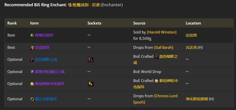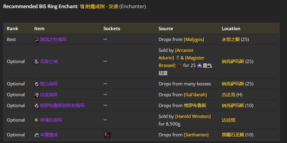 戒指装备团本前的最优解是肯瑞托指环、出血指环,P1阶段是湍流之针指环、无敌之戒,附魔推荐附魔戒指 - 突袭 团本前:
