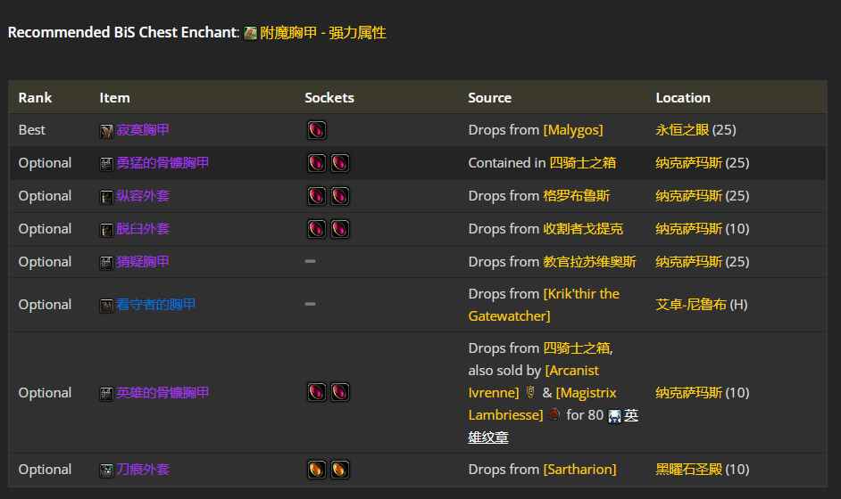 胸部装备团本前的最优解是英雄的骨镰胸甲,P1阶段是寂寞胸甲,附魔推荐附魔胸甲 - 强力属性 团本前: