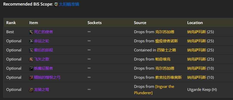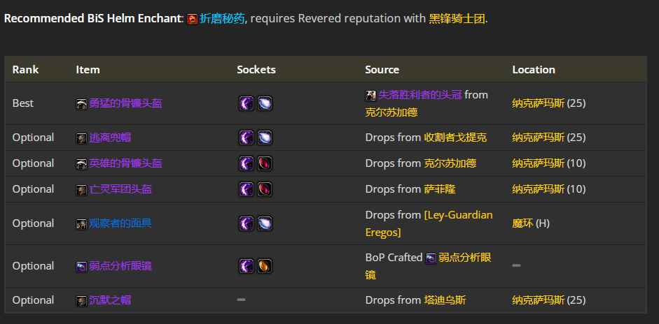 魔兽世界wlk版本快上线了,在WLK版本敏锐贼依旧是比较吃装备的职业,装备不好伤害就打不上去,那么魔兽世界wlk敏锐贼装备怎么获得?下面就给大家带来魔兽世界wlk敏锐贼装备获取路线。 魔兽世界14天游戏时间免费领取地址:点击查看 魔兽世界wlk敏锐贼装备获取路线魔兽世界WLK怀旧服敏锐盗贼的团本开放前和P1阶段的BIS装备推荐,另附装备的附魔等推荐。 头部装备团本前的最优解是弱点分析眼镜,P1阶段是勇猛的骨镰头盔 附魔推荐折磨秘药 团本前: