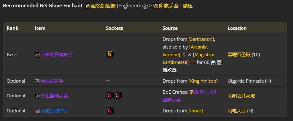 手套装备团本前的最优解是 英雄的骨镰护手,P1阶段是勇猛的骨镰护手,附魔推荐超级加速器、附魔手套 - 碾压 团本前: