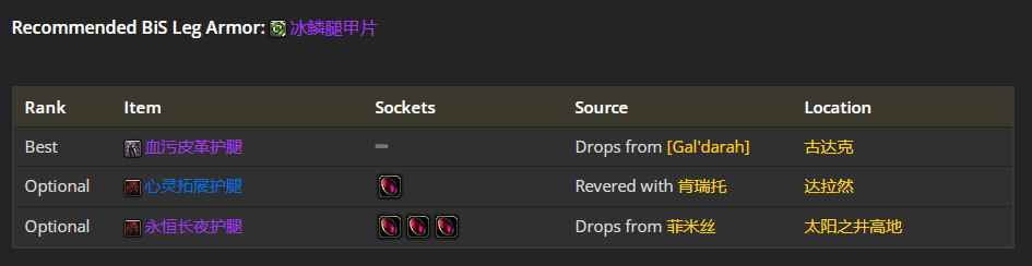 腿部装备团本前的最优解是血污皮革护腿,P1阶段是荣耀者的护腿,附魔推荐冰鳞腿甲片 团本前: