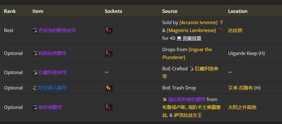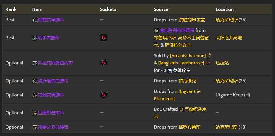 腰带装备团本前的最优解是乔拉克的鳄鱼皮带,P1阶段是眼梗皮革腰带 团本前: