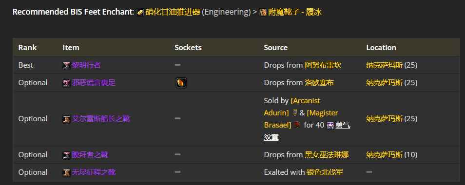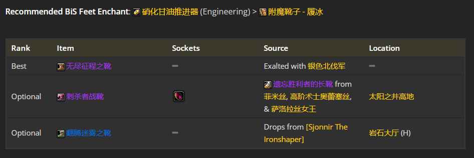 鞋子装备团本前的最优解是无尽征程之靴,P1阶段是黎明行者,附魔推荐硝化甘油推进器、 附魔靴子 - 履冰 团本前: