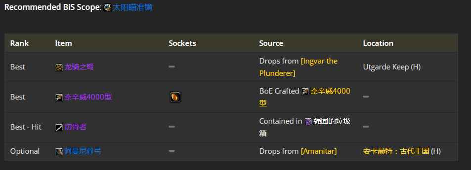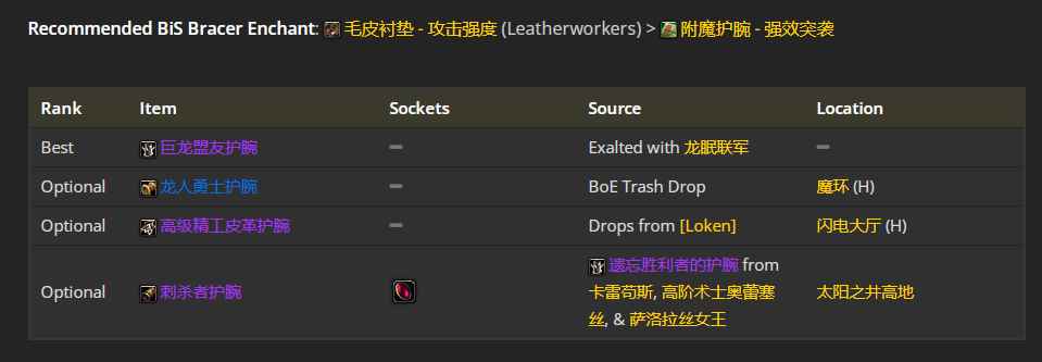 手腕装备团本前的最优解是巨龙盟友护腕,P1阶段是无情护腕,附魔推荐毛皮衬垫 - 攻击强度 团本前: