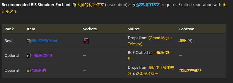 肩部装备团本前的最优解是粗心窃贼的护肩,P1阶段是勇猛的骨镰肩甲,附魔推荐强效利斧铭文 团本前: