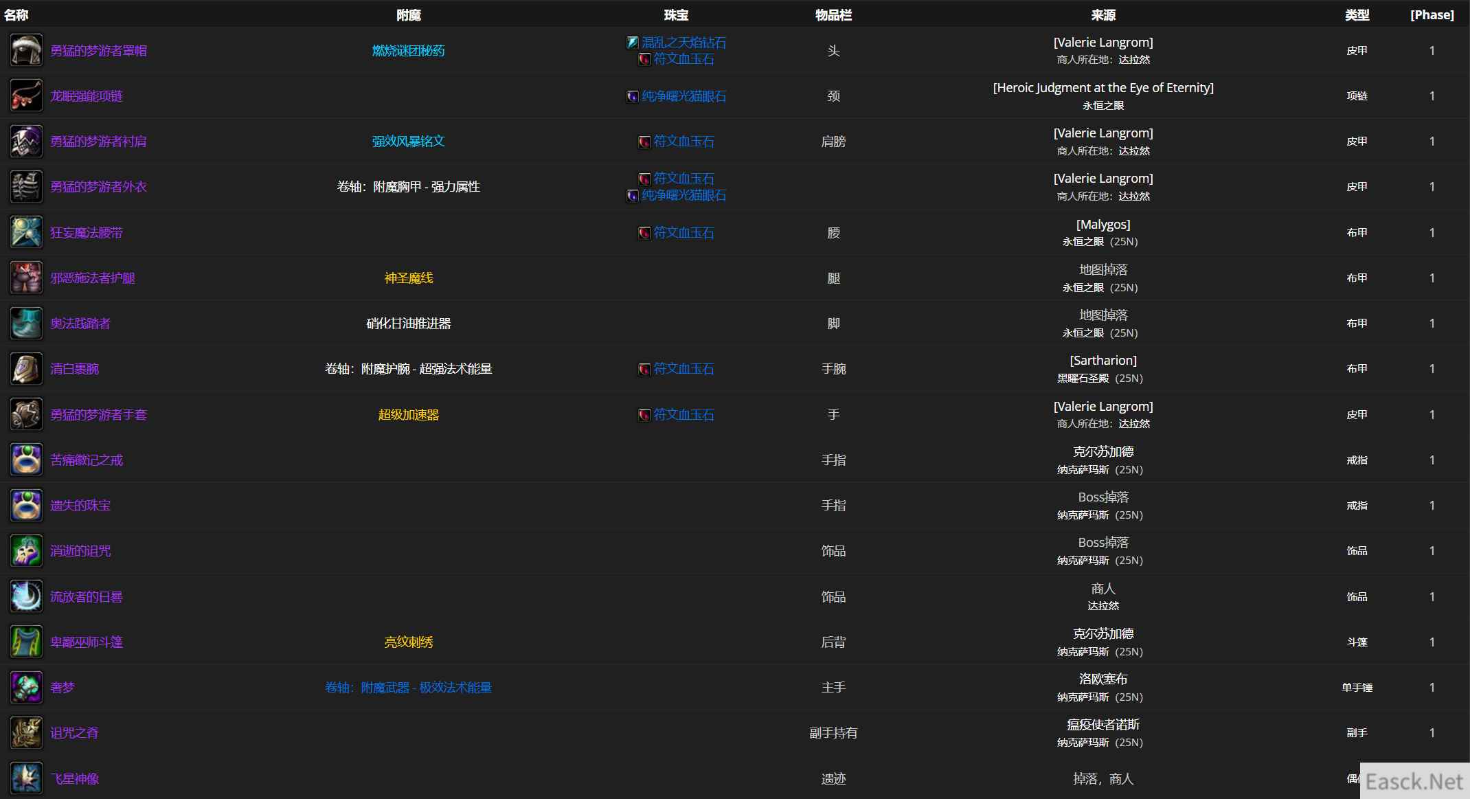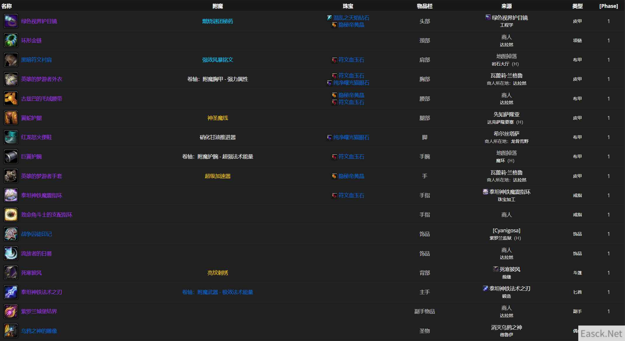 戒指我选择了现在相对好取得的213pvp带命中戒指(没荣誉的去混几场冬握湖就有了)。 披风如果死寒太贵(看各服海妖之泪价格),可选择德拉克赛隆要塞蓝装boe披风(精神法强+红槽)。 巨翼护腕可用紫罗兰的碧蓝布质护腕代替。 腿可用闪电大厅的织纹护腿代替。 主手武器可用肯瑞托崇敬蓝色法系匕首代替。 −P1阶段最佳装备列表&来源 ...