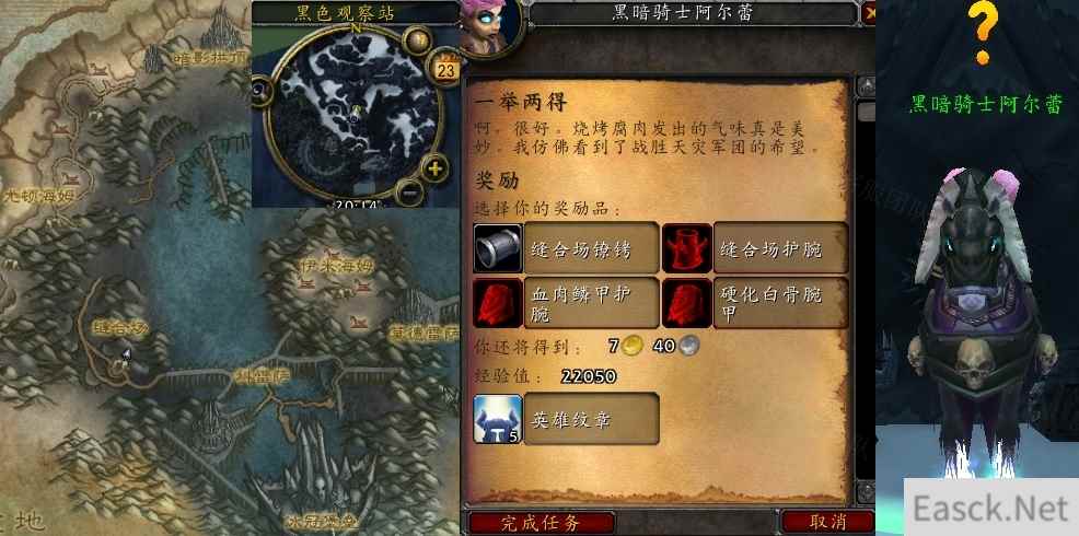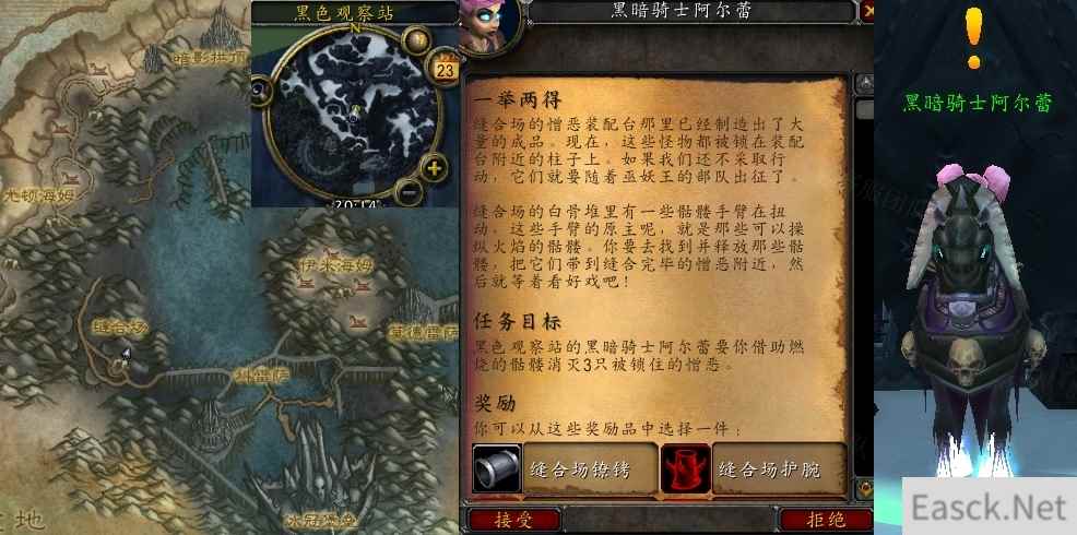 在魔兽世界怀旧服中,有着很多的任务,想必现在有很多玩家对于一举两得任务怎么做,具体怎么完成呢,相信很多小伙伴好奇,那么今天我就为大家带来了一举两得任务攻略。感兴趣的玩家一起来看看吧。 魔兽世界14天游戏时间免费领取地址:点击查看 一举两得任务攻略接取等级:77 接取NPC:黑暗骑士阿尔蕾(冰冠冰川,黑色观察站) 完成NPC:黑暗骑士阿尔蕾(冰冠冰川,黑色观察站) 奖励声望:250点黑锋骑士团 任务开始: