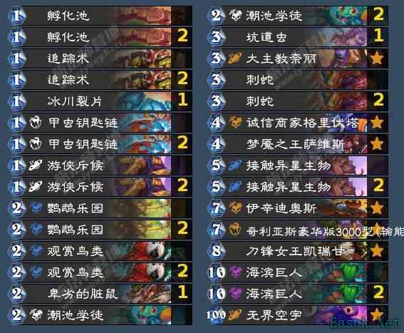 1.发现猎现在对于环境改动的影响不大,围绕巨人和发现体系框架这套牌还是有不错的胜率的。 2.带甲虫钥匙链可以弥补失去泰坦锻造陷阱后缺少的优质低费发现。 3.和上版本的发现猎思路一致,前期混过去,给地表巨人、接触异星生物减费,中期找潮池拿资源超展开压对手血线,后期通过伊辛迪奥斯刷爆发或者虫族套完成斩杀。
