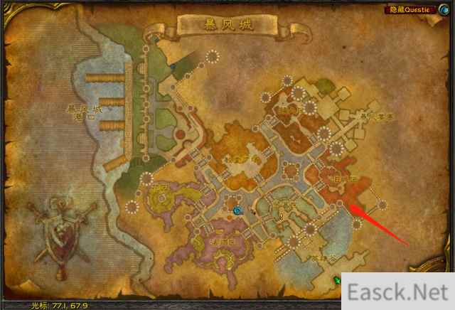联盟则位于联盟主城的军官兵营位置(坐标77.1,67.9)