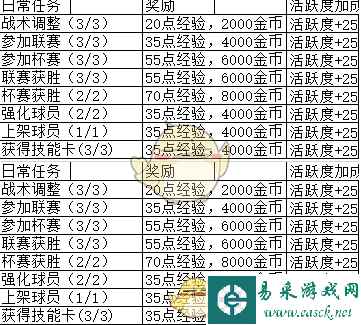 荣耀十一人里面的任务系统是一个十分重要的系统,小伙伴们完成任务系统之后能够获得大量的资源奖励用来培养球员,那么荣耀十一人里面的任务功能究竟应该怎么玩呢?下面小编就给大家介绍一下荣耀十一人任务系统功能简介,希望能够帮助到大家。 任务系统功能简介 1、日常任务 a、该功能在玩家达到8级时解锁 b、玩家完成每日指定任务,可获取活跃值、玩家经验、卡牌碎片&银币&钻石奖励 c、玩家累积一定活跃值后,可领取活跃宝箱。 d、每日任务每天0点重置