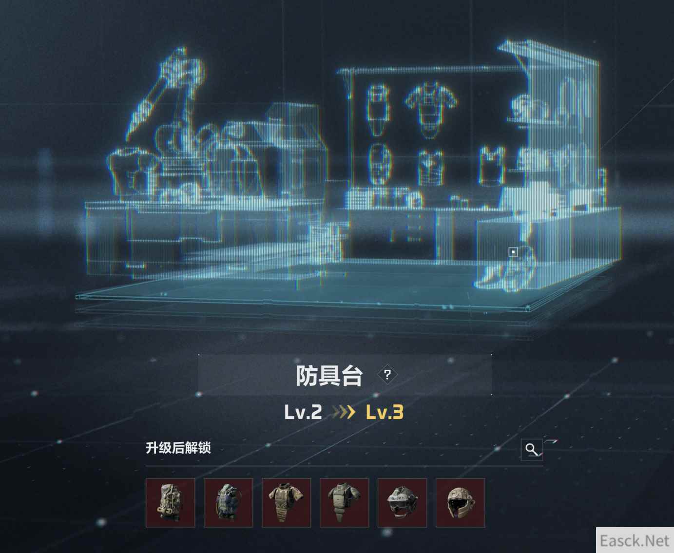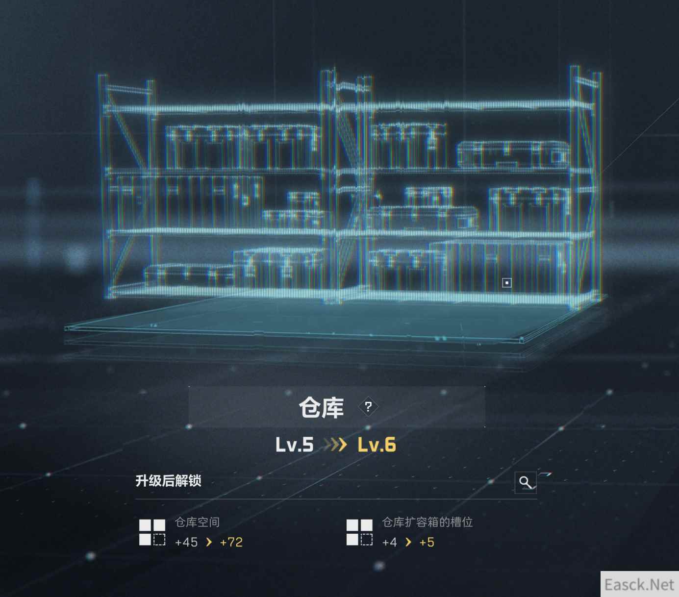 防具台升级 仓库则是干员们存放物资的地方,升级后可以提高仓库容量和扩容箱槽位,方便干员们储备更多物资。