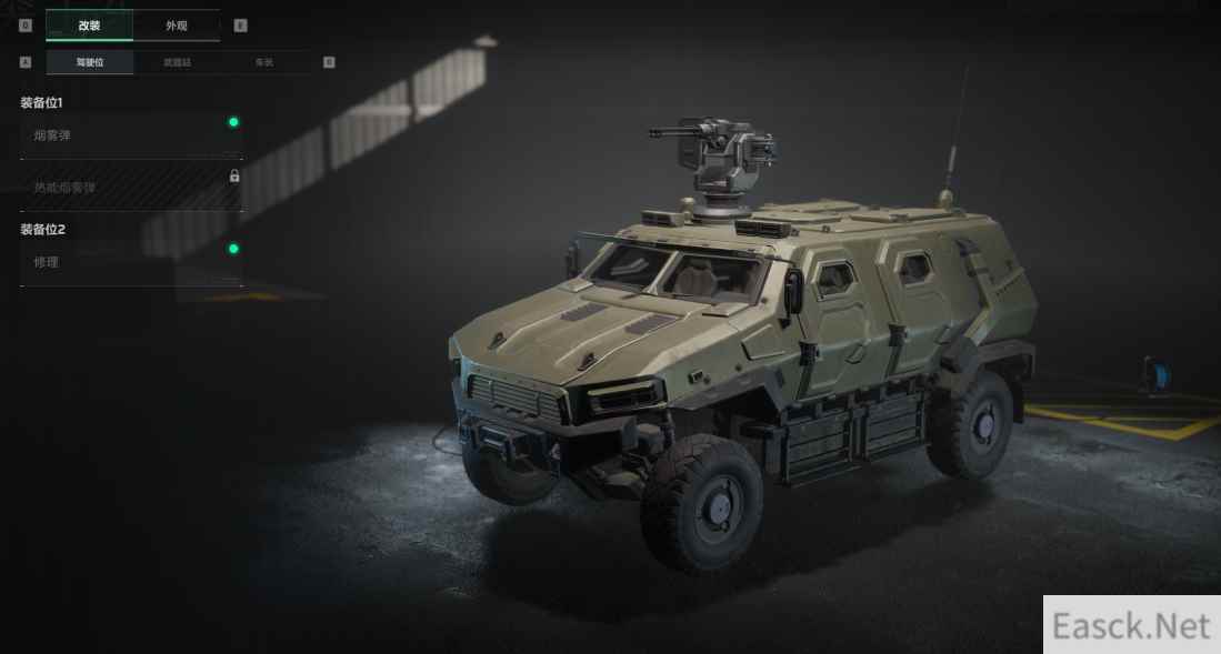 所有载具的驾驶位均会配备2个装备位。 装备位1通常默认装载烟雾弹,用于阻拦和干扰敌方视野。利用改装系统可选择将烟雾弹改装成干扰锁定追踪的热能烟雾弹,可以阻止导弹类武器的锁定与追踪。