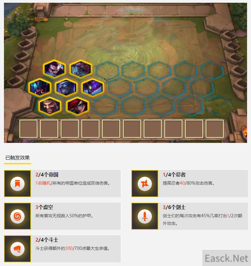 剑士阵容为剑魔、慎、剑姬、船长、德莱文、天使、金克斯、亚索、青钢影。金克斯搭配破败,饮血剑搭配德莱文,由于剑士卡组经常选择一字长蛇阵,所以出基克的先驱可以最大化收益,是一个很好的群体buff装备。
