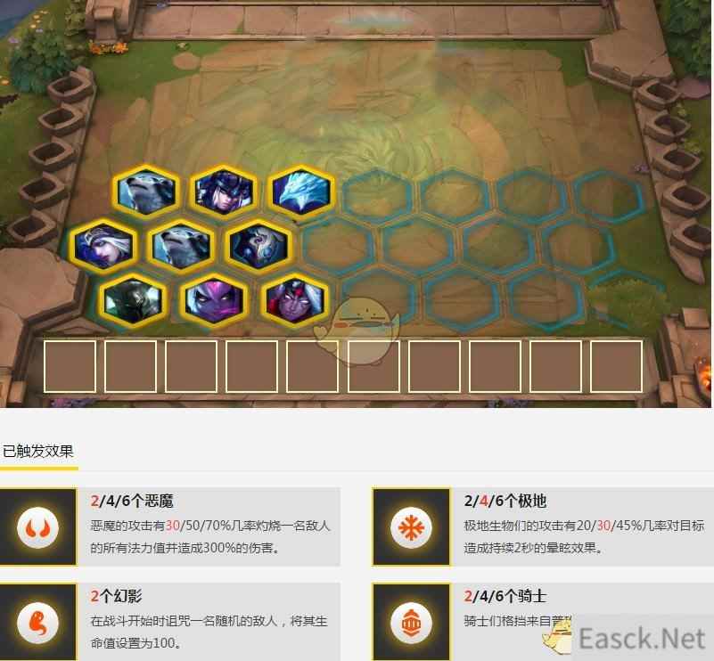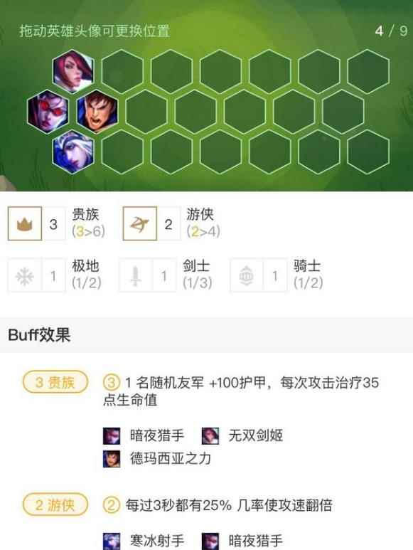 过渡 过渡期优先选择极地英雄:艾希、瑟庄妮、布隆。 其次选择恶魔英雄:韦鲁斯、蜘蛛、莫甘娜。 4费的高质量英雄选择:日女、猪妹。 如果你在前期选择了all in,那么在五人口时你可能会度过相当漫长的一段时期,因为需要保证金币到达50以赚取利息,尽可能的让自己经济最大化。 在五人口时阵容需要灵活调配 加入艾希或者韦鲁斯可以和薇恩触发双游侠羁绊; 加入布隆可以和寒冰触发双极地羁绊; 加入瑟庄妮可以和盖伦触发双骑士羁绊; 加入蕾欧娜可以和布隆触发护卫羁绊; 加入蜘蛛或者莫甘娜可以和韦鲁斯触发双恶魔羁绊。 通过这样的搭配,可以保证阵容中期的强度。当人口并不充足时,可以根据羁绊效果将已有的英雄换下,例如1星的蕾欧娜可以替换2星的剑姬,同样可以保证三贵族的羁绊效果。