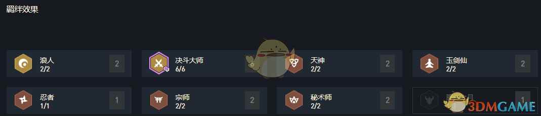 触发效果:2浪人&6决斗大师&2天神&2玉剑仙&1忍者&2宗师&2秘术师 运营思路 决斗大师的体系是11.5版本最容易运营也是收益最高的阵容之一。决斗早期的天选有1费卡的天选亚索、天选剑姬都可以拿,这样早期有3张决斗牌就可以凑出4决斗大师的羁绊,收益是非常高的,就可以直接往体系内过渡。现在玩决斗早期需要赌牌,如果有天选就尽早拉升5~6人口,存50金开始卡利息搜牌把1费卡的亚索、剑姬都给搜到3星,至少可以连胜到7人口的中期开始转型出容错。7人口就不搜牌了,尽快拉升8人口,在8人口主搜盲僧。盲僧可以说是决斗大师体系的Key卡和前排。盲僧的站位要跟对手的肉坨子、3星英雄对位,给到回蓝装以后盲僧可以以最高的效率让对手减员,决斗就要打的暴力点。