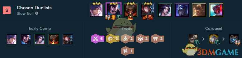 一代补丁一代神,代代版本玩决斗!决斗大师的体系能打出很高的爆发,尤其是在后期有滑板鞋、盲僧一些决斗英雄以后开局就能提供爆发性的攻速,让对手的阵容瞬间土崩瓦解! 阵容构成