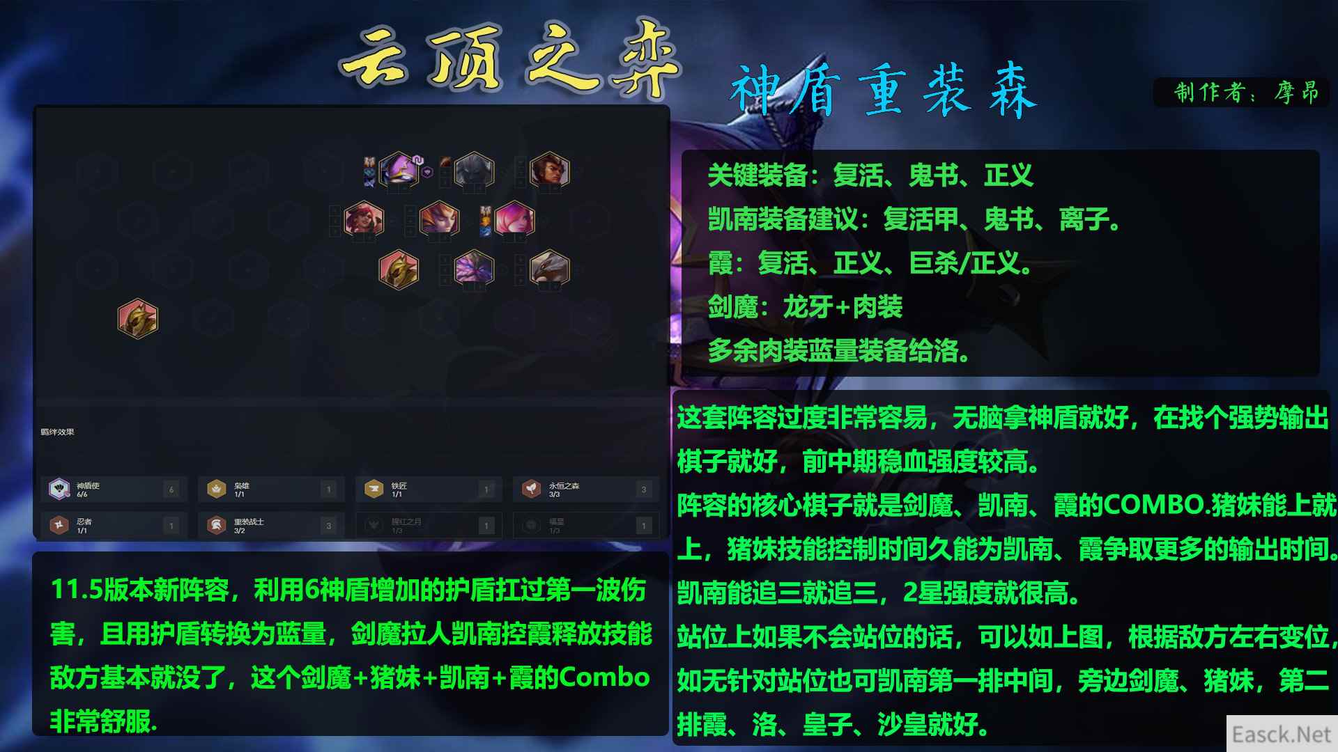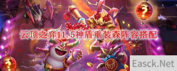 云顶之弈11.5神盾重装森阵容搭配凯南增强后在这套阵容中输出很报表,但更多是利用棋子技能的互动,形成combo,阵容控制非常足,全员控制,强度上很高,现在玩的人还比较少容易偷分。