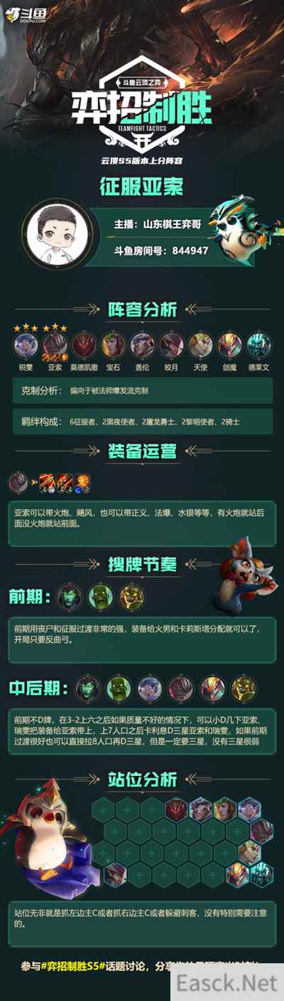 游戏《云顶之弈》中,这套阵容偏向于被法师爆发流克制。那么征服亚索阵容怎么玩?还是有很多玩家并不了解,各位小伙伴,让我们一起来看s5赛季征服亚索阵容搭配攻略。 s5征服亚索阵容搭配攻略