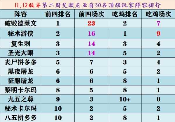 阵容详解 这版本刺客中妖姬被大砍,彻底退出主C行列,而卡特被小削弱且这版本后期秘术特别多无施展空间,很多人都觉得刺客式微。但其实不然摩昂在周报统计中,复生六刺在顶级玩家中出场率与吃分率非常高,前四场次与吃鸡场次均排名第三。