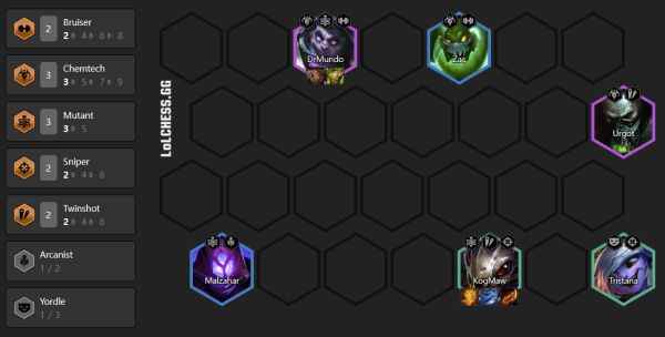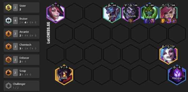这套阵容理解非常简单粗暴,主要就是蒙多与厄加特一个全坦出装一个纯物理DPS,装备上物理输出装备就好,多余属地法强给予风女就好。阵容5炼金后开始起飞,蒙多就像一个不死的战神。 6挑战永恩