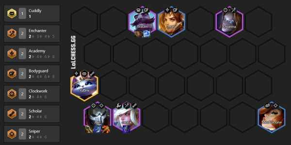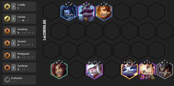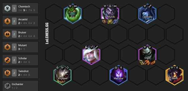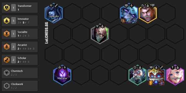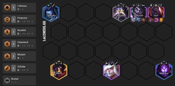 阵容主C就是拉克丝,玩过的朋友就能发现拉克丝技能的伤害非常高,再搭配强势前排抗伤吸收伤害,辅以4学者快速回蓝,拉克丝搭配法强装备秒人非常爽。阵容强度颇高! 炼金变异战枪