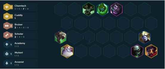 前期过渡体系我们可以选择炼金、老鼠、狼人以及青钢影,凑出3炼金科技以及2挑战者羁绊,炼金科技当炼金费卡生命值降低到一定值时,可以收益伤害减免以及攻速,而挑战者则是开局收益攻速,完成击杀后攻速可翻倍,两者搭配体系将输出系数拉满,可以稳定我们前期的运营节奏,保证一定的小连胜。