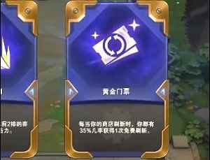 云顶之弈黄金门票怎么获得?云顶之弈黄金门票是一个非常好玩的海克斯科技,十分适合赌狗携带让英雄快速提升至三星稳住局面,接下来我来给大家带来云顶之弈黄金门票怎么获得的攻略,希望可以帮助到大家。 云顶之弈黄金门票获取指南黄金门票是在S6海克斯科技中随机获取的。 一、黄金门票效果 1、每当你的商店刷新时,你都有35%几率获得一次免费刷新。 2、而在测试服中10月23日更新中对概率进行了调整,提升至40%。