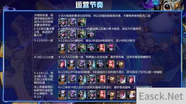 装备方面: 小丑: 火炮必备,防止被遛狗,其次小丑的蓝条是70点,火炮可以让小丑的技能释放更加快捷,其次无尽,无尽这件装备依旧是刺客的神装,如果外面反甲多可以考虑不出,用轻语羊刀巨杀来代替。最后一件推荐巨杀,因为后期会有大肉带3件防装,没有巨杀小丑很可能打不动人。 艾克: 这个赛季的艾克虽然是3费卡,但是技能却强的变态,堪称小丑的顶级辅助,艾克的技能可以让圈内棋子减攻速然后为圈内队友加攻速,独特的双buff技能让艾克直接晋升小丑的保护位,所以给到艾克的装备应该是利于小丑输出的装备,首先推荐冰心,减对方后排的攻速,保证小丑挨揍不会死,其次鬼书,艾克跳的位置是可以直接对后排释放技能的,所以给后排释放技能的时候挂上重伤再合适不过了,最后一件推荐青龙刀,艾克的蓝条实在是太长了,给一把青龙刀可以让艾克多开1到2个技能。 布隆:捡破烂即可,小丑和艾克不要的散件给布隆留着即可。 如果输出装溢出可以留着养阿卡丽,这套阵容只要小丑神装,剩下的装备无论是防装还是输出装都可以消化。 海克斯选择: 羁绊类,经济类,D牌类,团队增益类,吸血类