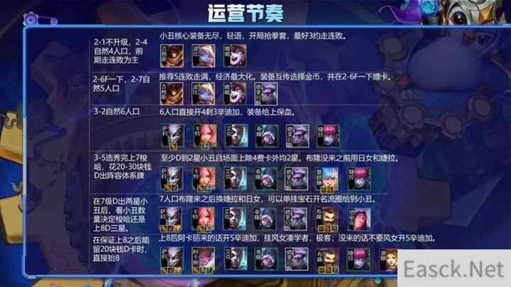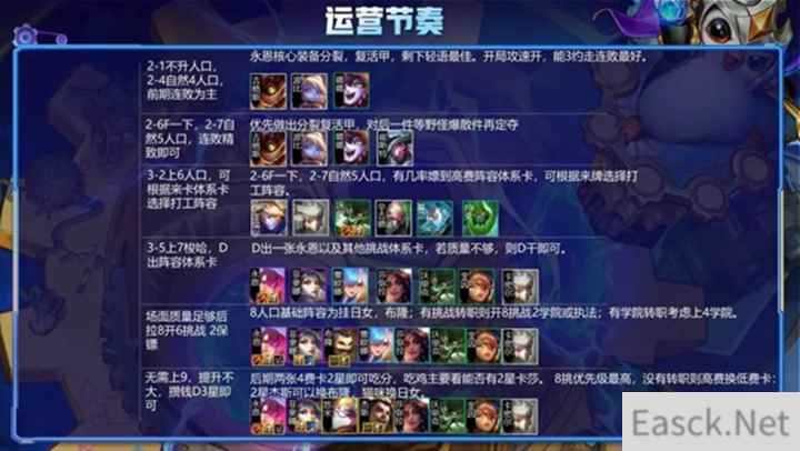 2阶段:2-1不升人口,2-4自然到4,2-6F一下,2-7自然到5。 前期走连败,不是特别胡的情况下不留体系牌。最好拿约德尔养经济,如果场外有连败空城,我们也直接空,剩下看天意。推荐走满5连败且在装备互选阶段时拿金币,这样的话就可以在2-6F一下,方便打石头人时得到阵容体系牌。 3阶段:3-2升到6级,3-5选秀回来冲7梭哈。 正常单人运营刺客阵容会在3-2小搜一波,找到4刺,由于双人模式节奏要相同,所以在3-2选择不搜,在选秀回来3-5上7大D,找小丑的同时也可D到队友剑姬与永恩。3-5上7人口后基本都有40块钱去D卡,留10-20块钱即可,有一星永恩就可以传给队友,并商量一下双方装备处理。场面上除4费卡全2后停手,如果小丑多的话,可以选择在7级慢D;小丑少并且血量不低的情况下可以上8找阿卡丽换主C。 7级阵容搭配十分灵活,基础为3辛迪加 4刺客 2保镖,布隆没来之前上日女,婕拉。布隆来了之后:如果名流位置很好,可以挂宝石,名流圈给小丑吃,提高伤害;如果有刺客转职,则优先上6刺;有辛迪加转职可开5辛迪加。 4阶段:场面质量足够后开始存钱准备上8,存钱过程中注意针对性站位 打完狼4-1还会有一个忠诚符文,双方均没D到永恩且队友没经济,我们则需要帮助队友继续D一张永恩传过去,保证他能在4阶段稳定住,双方不掉容错;若队友有一星永恩,我们有两张,则考虑队友传送过来,我们合成2星传给队友提高质量,注意不要忘了装备传过去。 4阶段是刺客的强势阶段,现在大多都是在7级D卡或者摆烂上8的,所以在4阶段我们是无敌的存在。阵容站位要注意,除刺客外剩余所有怪沉底,方便让对面C位前进一格,刺客跳过去很容易切掉。艾克放在小丑旁边,方便小丑吃到攻速以及不被集火,针对对面C位调位即可,如果对面缩角站,则跳中间。 5阶段:大概5-1阶段升至8人口 上8根据D卡情况而定,出去上人口花费外能保证剩余20-30D卡,我们就可以直接抬人口。上8提升特别大,5辛迪加才是阵容的关键。如果阿卡丽来的话,则换卡特,并且上风女可凑出2学者,2极客羁绊。这套阵容优先辛迪加转,7辛迪加收益大于6刺客。若有刺转可以下卡特,上发条,或萨勒芬妮,凑2白法师或名流。4刺客就够用了,不一定追求6刺客极致爆发。 6阶段:质量足够后开始存钱上9或者考虑追3星 6阶段选择存钱上9或者追三星,双方需商量一下,兔子建议质量足够的情况下上9是最好的选择。因为9级能找到2星阿卡丽与2星卡莎,均能提高双方阵容上限。 挑战永恩运营节奏: